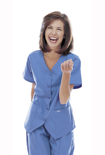 LANDAU LADIES WESKIT SCRUB TOP STYLE 8253 Tailored tunic features vest front styling with set-in sleeves, five-button front closure and patch pockets.
