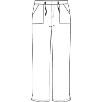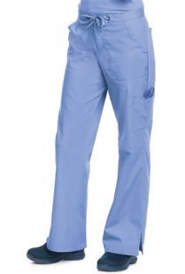 Contoured waistline with grommet drawstring to fit at natural waist.  Full separating zipper.  Flare split leg.  Two off-seam pockets, two back pockets, and one cargo pocket on mid- thigh.  65% poly/ 35% cotton.